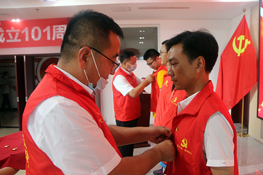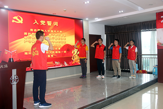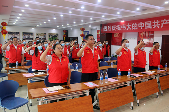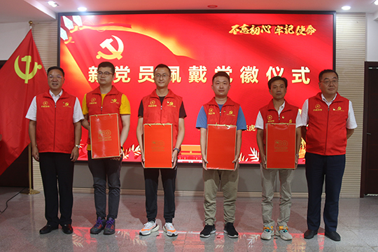 黨委書記謝平、黨委副書記李張虎為新加入黨組織的預(yù)備黨員趙科、李雄杰、郭凱、張學(xué)東佩戴黨徽并贈(zèng)送入黨紀(jì)念品。黨委委員賈永燦帶領(lǐng)新黨員宣誓、全體黨員重溫入黨誓詞,用莊嚴(yán)儀式表達(dá)對(duì)黨的真摯祝福和對(duì)祖國(guó)的熱愛?!拔抑驹讣尤胫袊?guó)共產(chǎn)黨,擁護(hù)黨的綱領(lǐng),遵守黨的章程,履行黨員義務(wù),執(zhí)行黨的決定……”面對(duì)鮮紅的黨旗,黨員們右手握拳,莊嚴(yán)宣誓,滿懷激情的宣誓聲響徹培訓(xùn)中心。